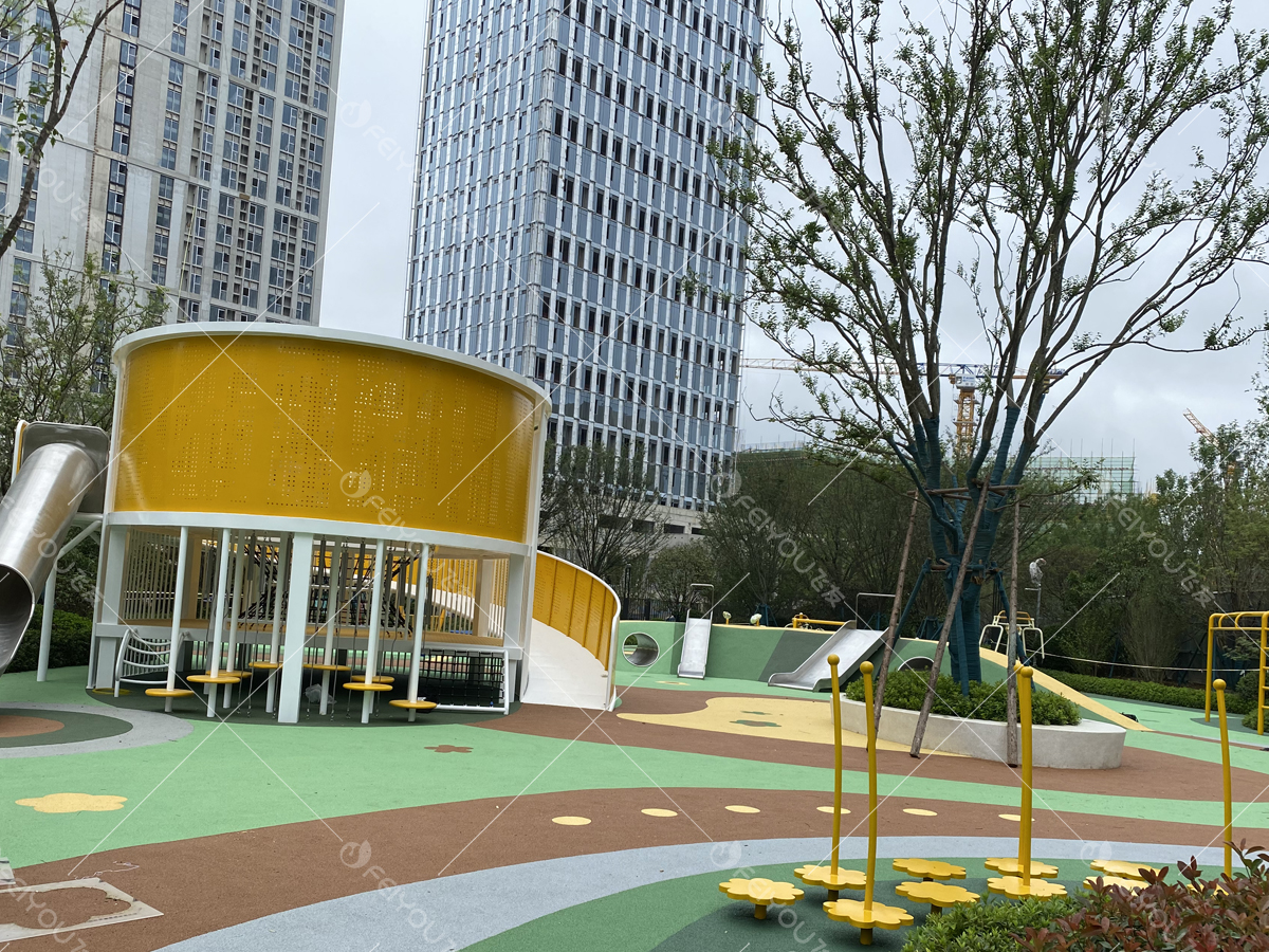 兒童景觀設(shè)施空間分為多個模塊,滑梯坡、秋千、蹦床、搖搖車、健身器材等,各式各樣的搖搖車和傳聲筒更是為孩子們在內(nèi)游玩增添了不少的樂趣。