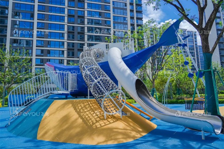 該游樂器械設(shè)計(jì)了不同高度的滑梯。一個(gè)模仿鯨魚的魚鰭,另一個(gè)則從二層平臺(tái)直接延伸至地面,孩子可以通過爬筒輕松到達(dá)二層平臺(tái),滿足了不同兒童的需求。