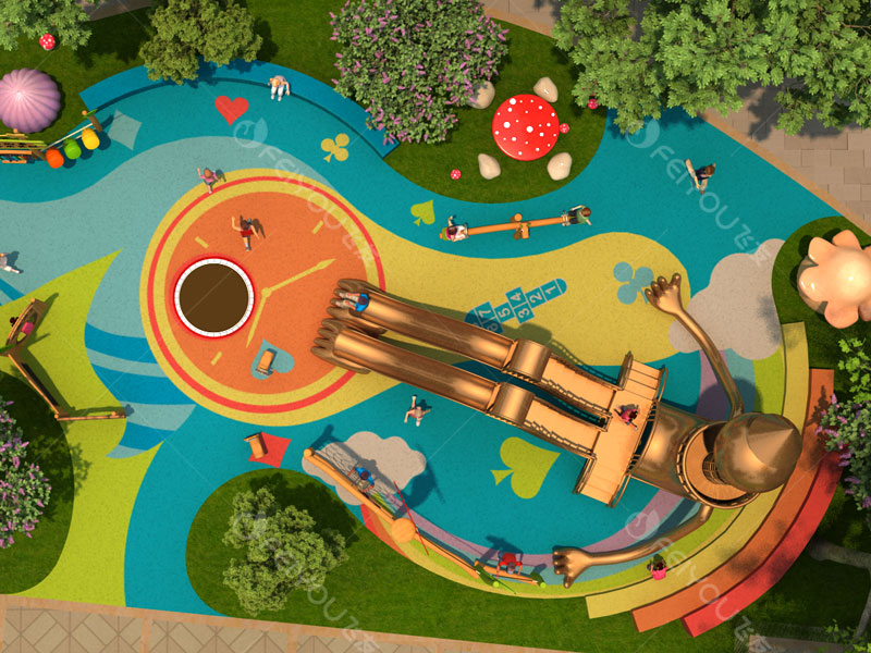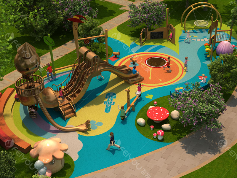 本設(shè)計以“銅人”造型滑梯為中心,輔以鳥巢秋千、蘑菇小屋、告示牌等造型玩具,培養(yǎng)幼兒鉆、爬、滑、晃等能力,為幼兒提供全方位的游戲體驗