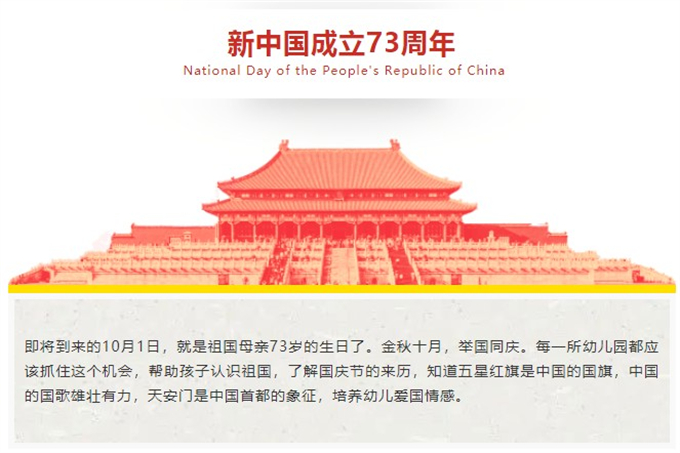 即將到來的10月1日,就是祖國母親73歲的生日了。金秋十月,舉國同慶。每一所幼兒園都應該抓住這個機會,幫助孩...